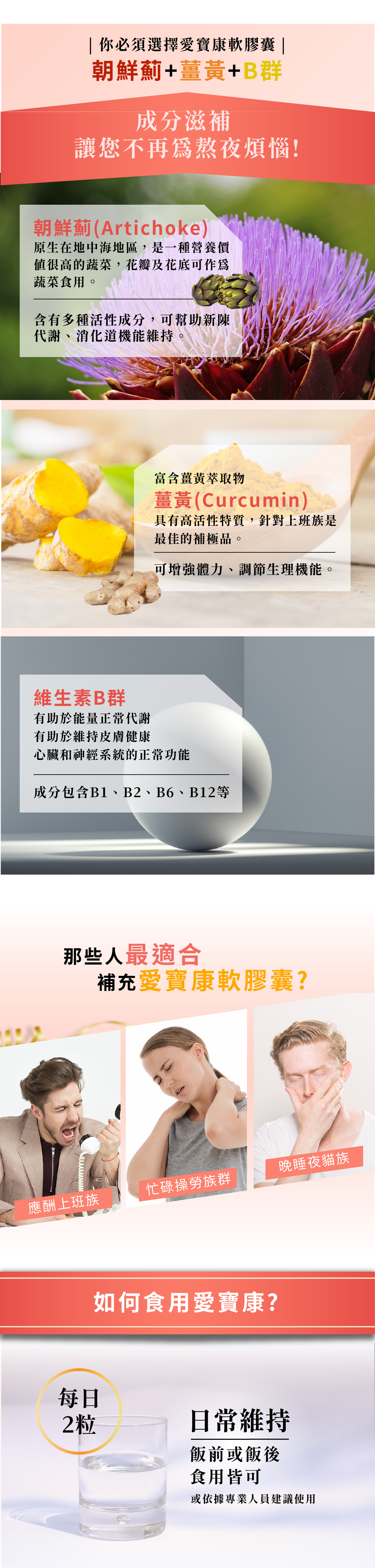 成分:大豆油、肝粉、肌醇、膽鹼、DL-蛋胺酸、朝鮮薊萃取物、磷酸氫鈣、薑黃萃取物、葉下珠萃取物、維生素B3、維生素C、維生素B2、卵磷脂、維生素B1、維生素B6、脂肪酸甘油酯、維生素B12、葉酸